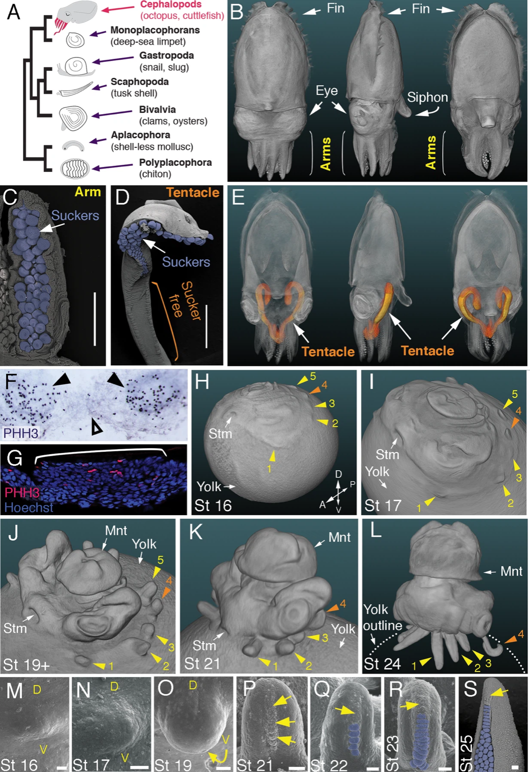 " To test the hypothesis that cephalopod limbs evolved by recruitment of an ancient gene regulatory network for appendage development that is conserved across Bilateria, we investigated arm and tentacle development in embryos of the cuttlefish, Sepia officinalis."