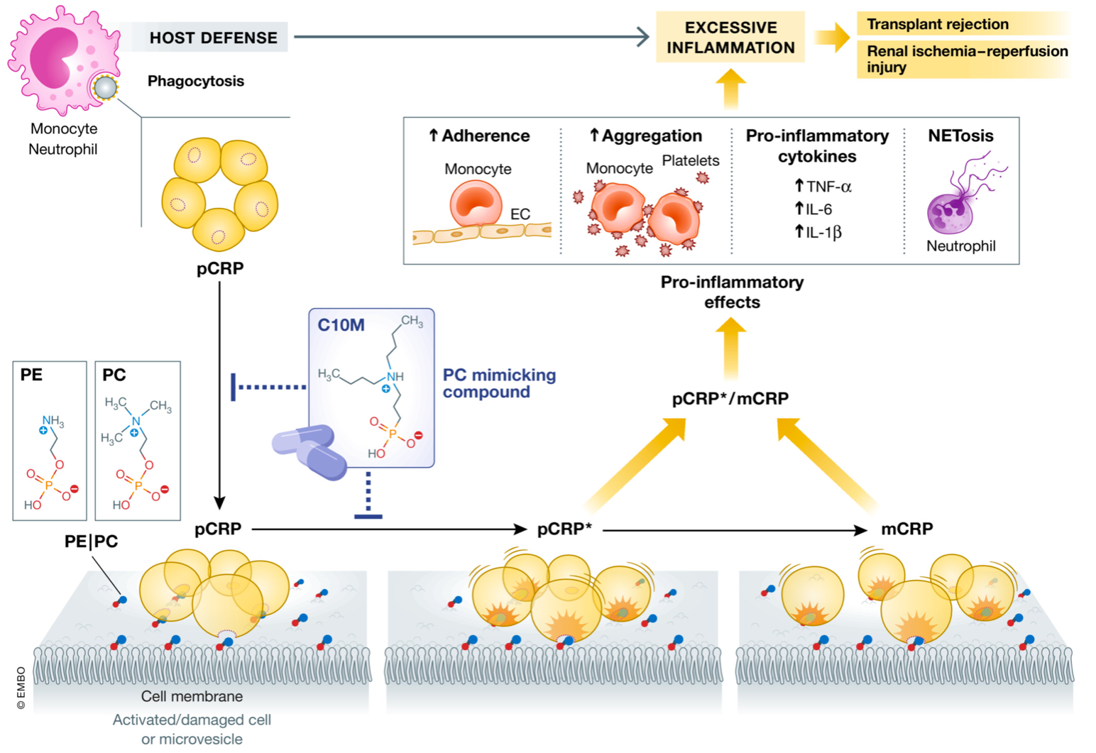 'In this issue of EMBO Molecular Medicine, Zeller et al report development of a novel low molecular weight phosphocholine-mimetic that binds to pCRP and inhibits conformation change-mediated expression of pro-inflammatory actions without impairing its defense function and demonstrate its beneficial actions in preventing rejection of allograft transplants and renal ischemia–reperfusion injury.'