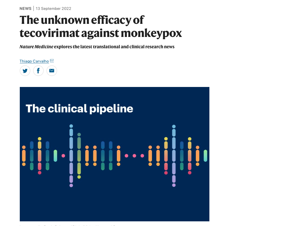 Gathering real world data on the efficacy of drugs and vaccines used to treat or prevent #monkeypox is vital. Many where developed for #smallpox and approved via the FDA's "animal rule", which means that although the safety data is there, the efficacy is essentially unknown. I wrote a bit about this for #NatureMedicine in September when looking at the use of the #antiviral #tecovirimat for monkeypox.