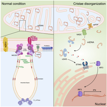"Taken together, beyond revealing the central role of cristae architecture to prevent mtDNA release and inflammation, our results mechanistically link mitochondrial cristae disorganization and inflammation, two emerging hallmarks of aging and aging-related degenerative diseases."