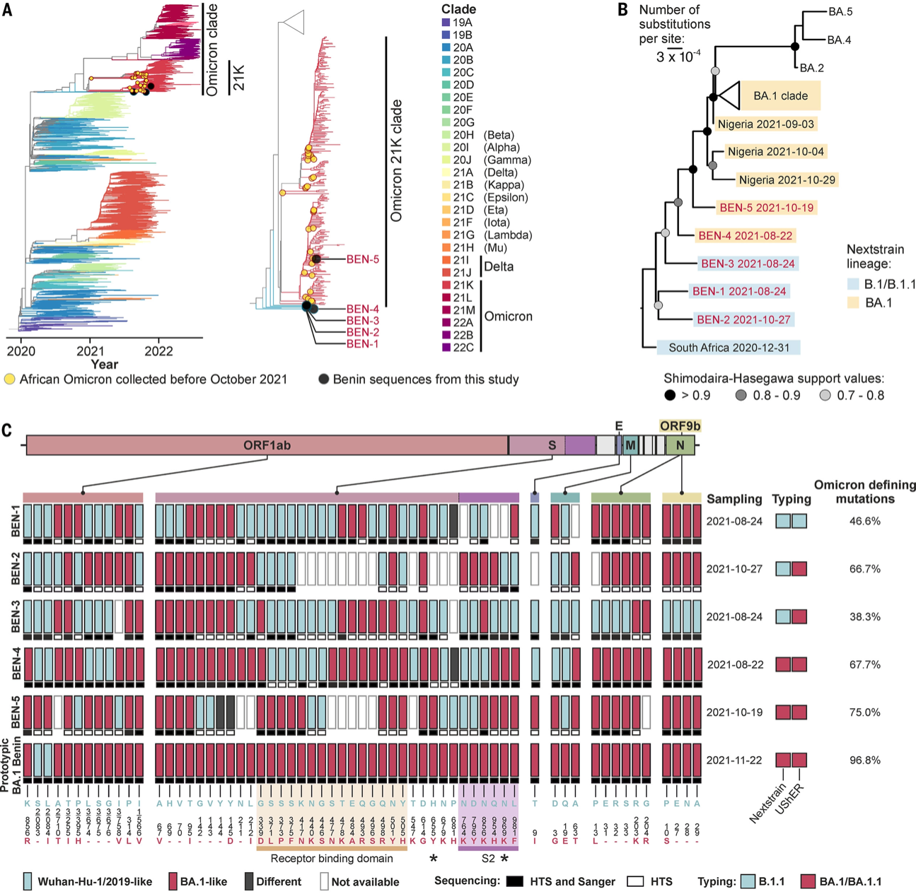 "Together with other Africa-derived BA.1-like sequence entries, the Omicron ancestors clustered in basal sister relationship between the Omicron clade sensu strictu, the BA.1 sublineage and Omicron ancestors belonging to the globally circulating B.1 lineage (Fig. 3, A and B). Phylogeographic analyses supported BA.1 origins in Western Africa preceding spread in Southern Africa (fig. S4), which was consistent with the PCR-based data (table S2)."