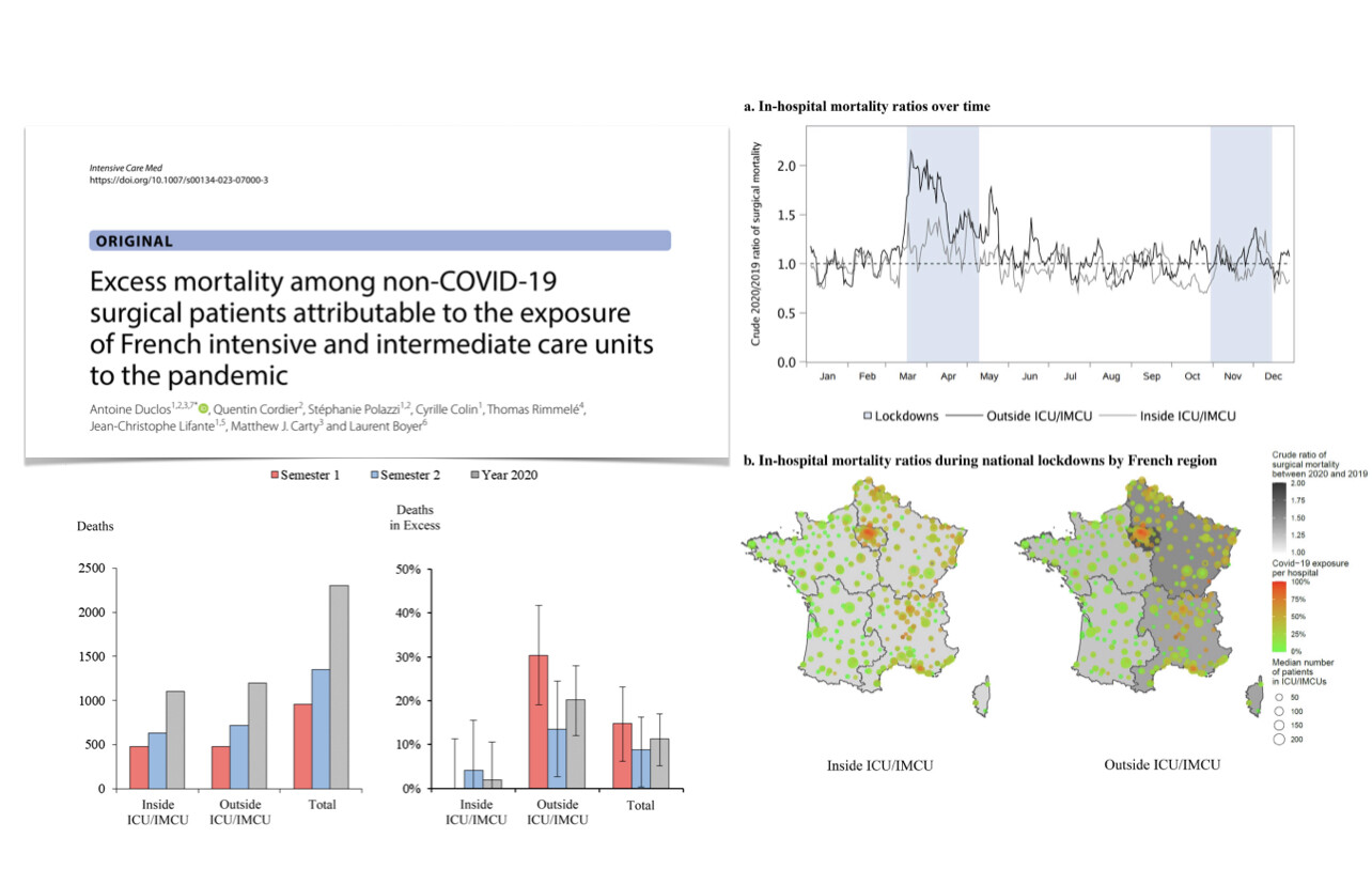 Excess mortality among non #COVID19 surgical patients in 🇫🇷 French intensive & intermediate care units during #pandemic, nationwide study demonstrating considerable increase in surgical death risk during periods of high hospital exposure to #SARSCoV2 cases in ICU/IMCU beds. The majority of excess in‐hospital mortality resulted from inpatient deaths outside of #ICU/IMCU, suggesting limited access to critical care following surgery.