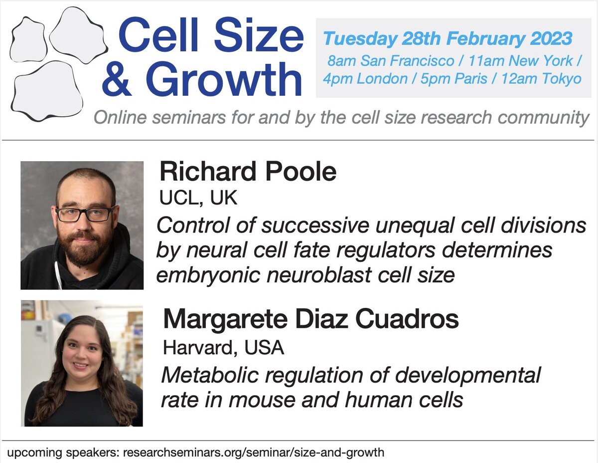 📢 Join us on Tuesday as we restart the Cell Size & Growth seminars with talks from Richard Poole and Margarete Diaz Cuadros.