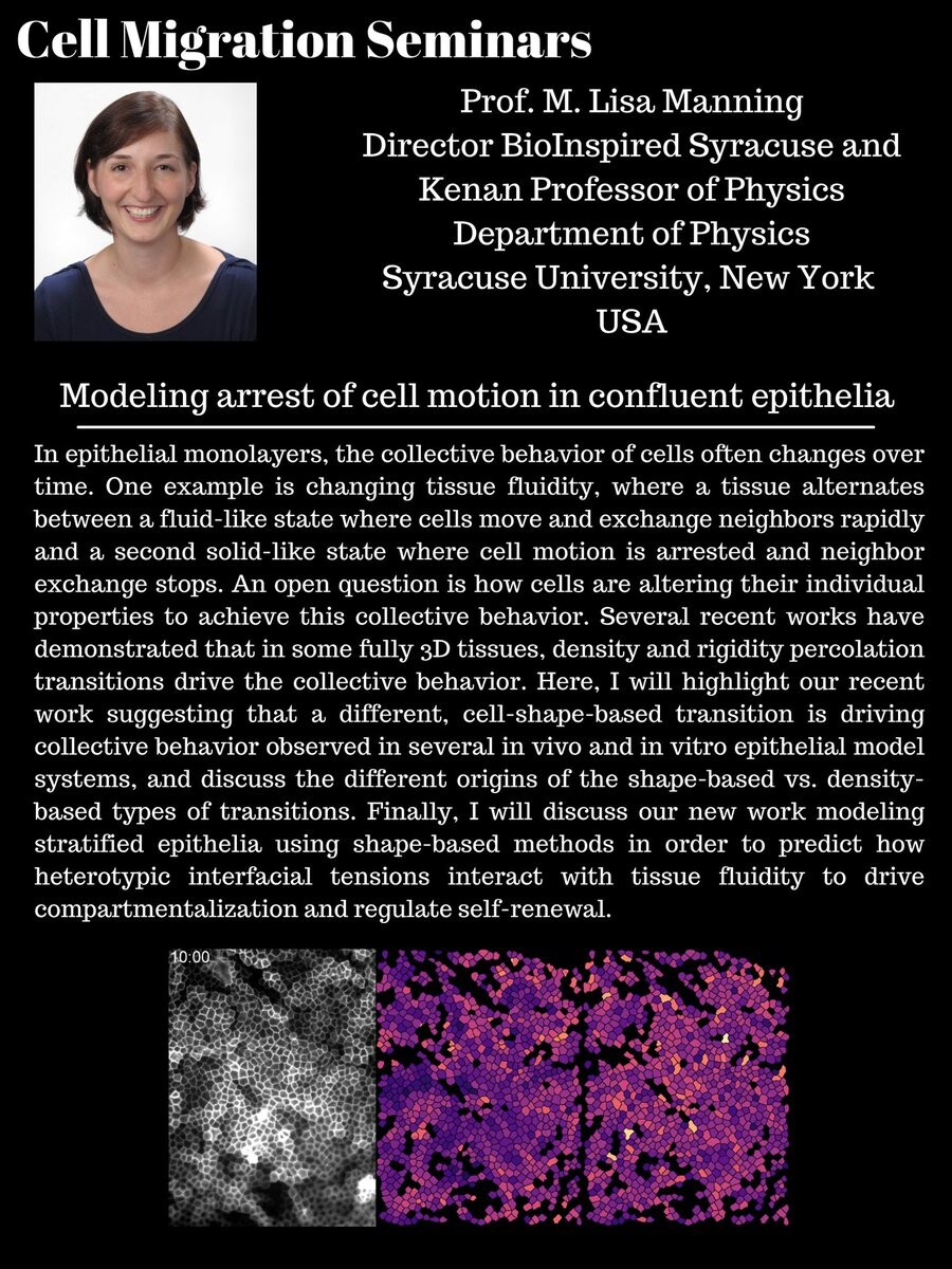 Hello cell migration peeps, our next seminar is going to be by Prof. Lisa Manning on coming tuesday on 21st March at 11 am ET. Please check your local time 😀