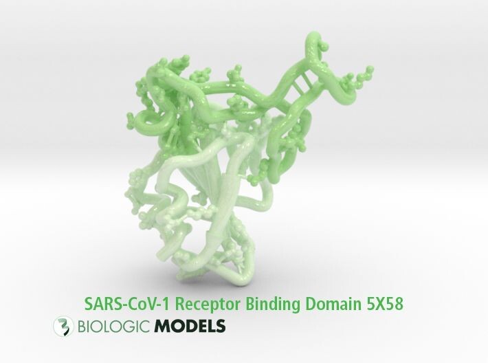 As part of our ongoing SARS-CoV2 Receptor Binding Domain series, below is a 3D print of the SARS-CoV1 RBD. This model was used to compare against SARS-Cov2, RATG13, and the Pangolin Virus receptor binding domains for insights about subsequent mutations.