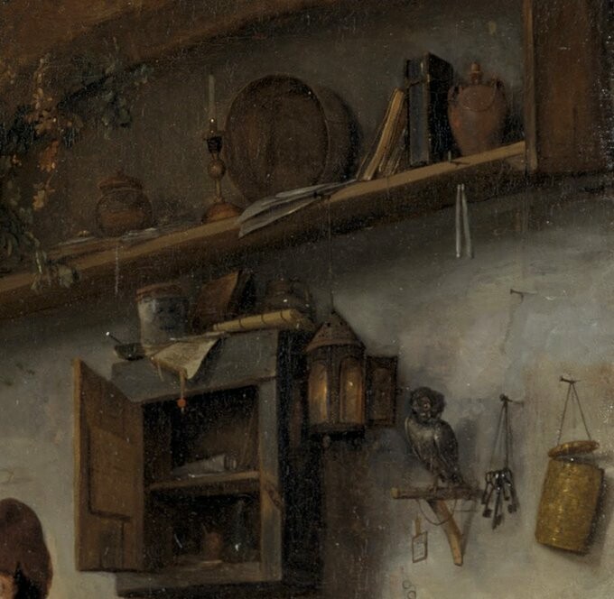In the upper right corner of the room we see the usual artifacts of the so-called book industry: a bound book, an unbound book, loose paper sheets in different formats, fresh and used papers. A learned setting and everyday business of dealing with paper and knowledge. This is what #BookHistory usually looks at. All these old and new, big and small books, and all kind of bookish formats were paper products, paper worlds made of paper. #BookHistory of early modern Europe is #PaperHistory.