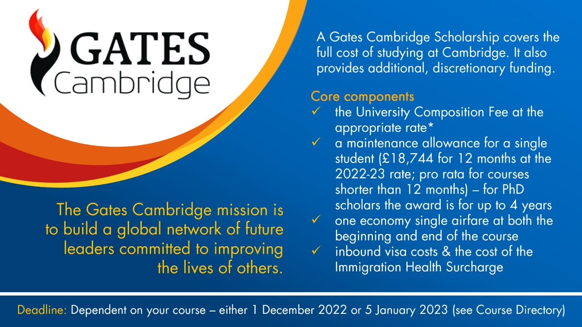 Each year @Gates_Cambridge offers c.80 full-cost scholarships to outstanding applicants from countries outside the UK to pursue a postgraduate degree in any subject available @Cambridge_Uni. More info: bit.ly/GatesCambridgePG