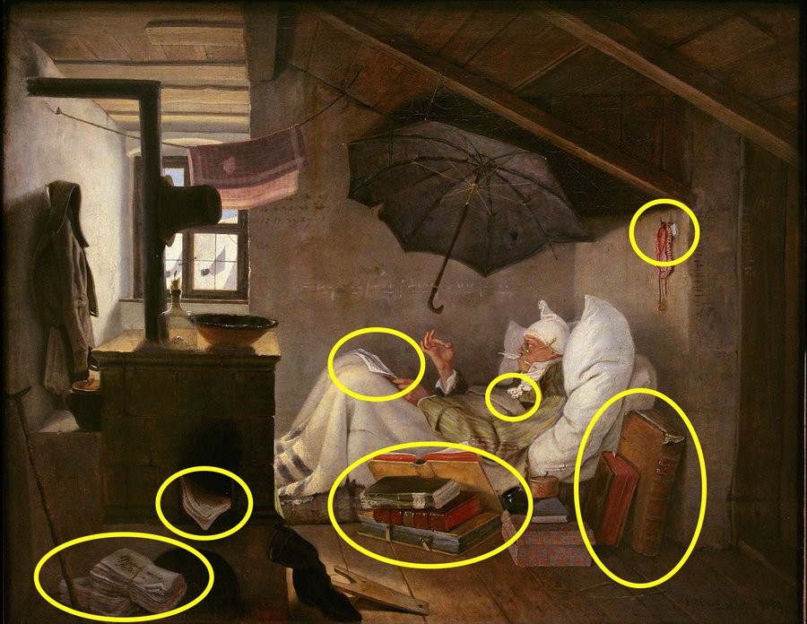 There is a paper story included into this famous German painting of 1830s from Carl Spitzweg. You may know the common interpretation of the Poor Poet (German: Der arme Poet): Attention to the material misery of most artists and their work!