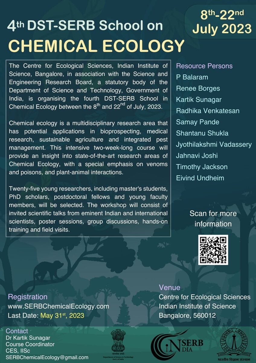 We are excited to announce the 4t DST-SERB School on Chemical Ecology to be held at @CES_IISc, @iiscbangalore, Bangalore, between the 8th and 22nd of July 2023.