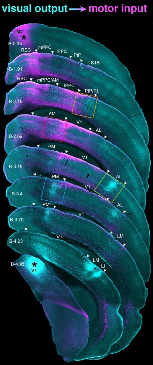 To anyone with eyes: ever wonder how visual signals get to the motor system? We did. So we mapped the anatomy in mouse cortex and made it into sweet eye candy: the great work of @KarolineHovde @Idavrautio Andrea-Marie Hegstad, with Menno Witter!