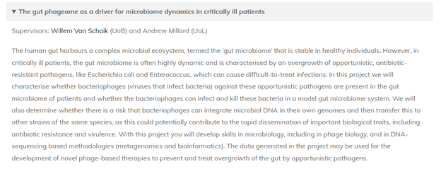 I am looking for a PhD student in the MRC AIM Doctoral Training Programme on the project 'The gut phageome as a driver for microbiome dynamics in critically ill patients', a collaboration with