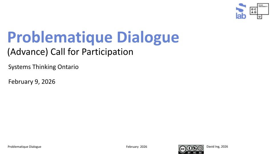 Slides + web video of "Problematique Dialogue + Conversation as Process and Connection" from #SystemsThinking Ontario from 2026-02-09. sLab at OCAD University is evolving Banathy Conversation from residency to urban campus. Advance Call for Participation for May.