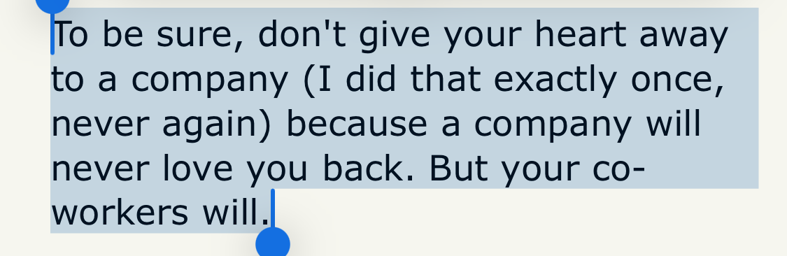 The joy you find in your job does not come primarily from the company, organization, even its mission. It comes from good people you get to work with