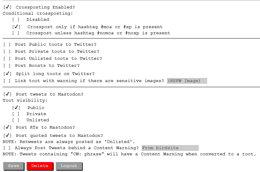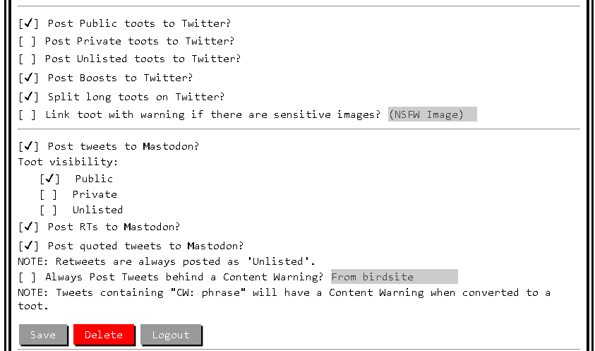 @Sphinx It's supposed to allow cross postig both ways. Here's a screenshot of my own settings, although in my case I am only going tw-masto.