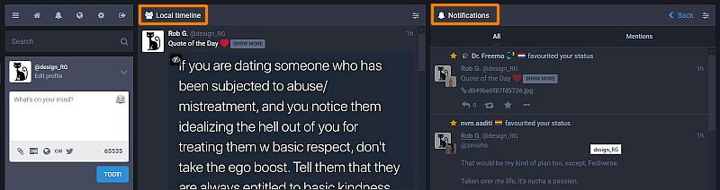 Have now figured out a way to make my laptop settings for the mastodon Web Client really sharp – it is using the FULL screen width, but without the madness of the multi-pane, 3 pulsating Feeds running simultaneously which is kind of the Default when you enable it.