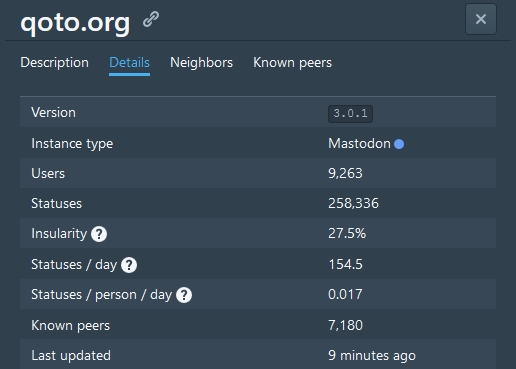 You can see it on the Datails tab at this page : https://www.fediverse.space/instance/qoto.org