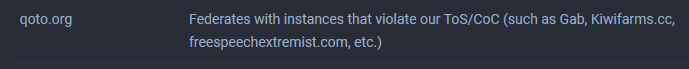 They list Qoto, and the justification seems to be the same as mastodon.technology -- for federating with instances they disapprove of.
