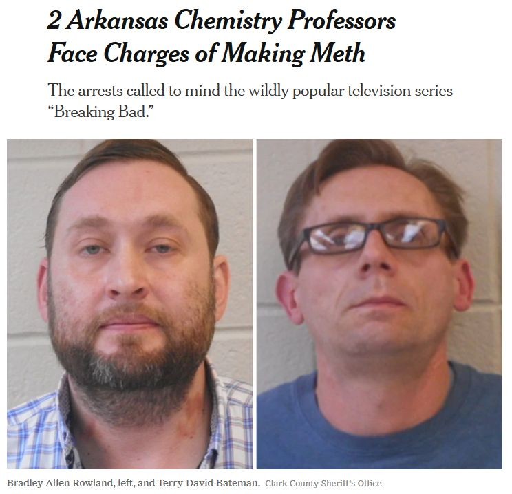 "It sounds like something from the award-winning former A.M.C. series “Breaking Bad”: The authorities charged two chemistry professors in Arkansas on Friday in connection with the production of methamphetamine.