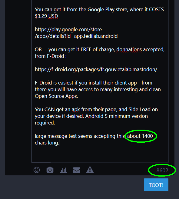 - as I typed and later copy/pasted a large block of text, copied from one of my posts here, all thru this the Toot button was enabled, and the counter was decreasing.