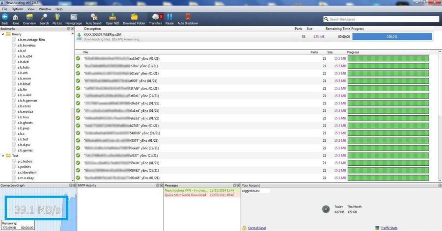 * Files posted in the newsgroups will be around for a LONG time, unlike some of the p2p methods were people are interested at first, but later it is hard to complete a download, few seeders, etc.