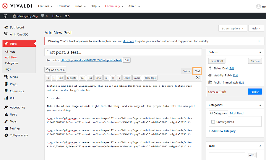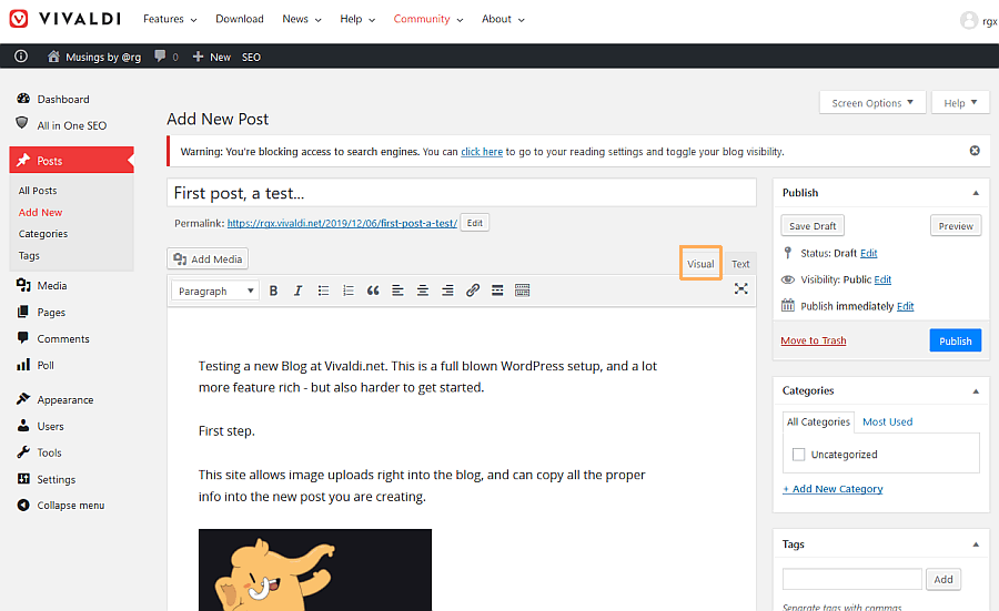 For curiosity and comparison purposes, I went ahead and started a first post. The blogs at Vivaldi are using WordPress, and offer a lot more controls, formatting options, online image hosting, but at the price of a more complex interface to be learned.