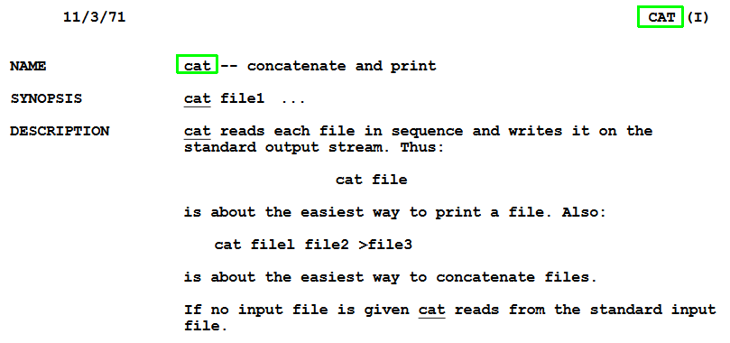 "The first edition of the Unix Programmer's Manual, dated November 3, 1971, is available here in image, Postscript, and PDF format. Return with us to the golden days of yesteryear!