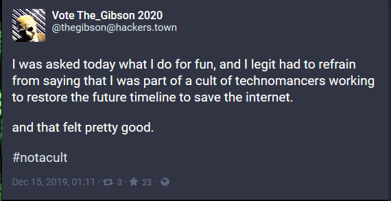 "I was asked today what I do for fun, and I legit had to refrain from saying that I was part of a cult of technomancers working to restore the future timeline to save the internet.