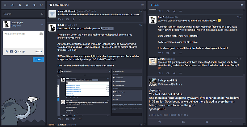 Now that I have found a good layout, the Advanced Widescreen Interface in the mastodon web client is really wonderful.