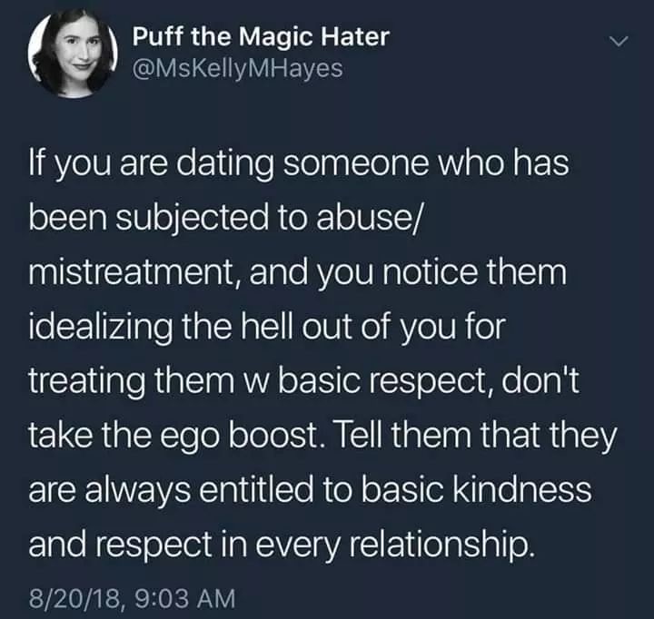mistreatment, and you notice them idealizing the hell out of you for treating them w basic respect, don't take the ego boost. Tell them that they are always entitled to basic kindness and respect in every relationship."