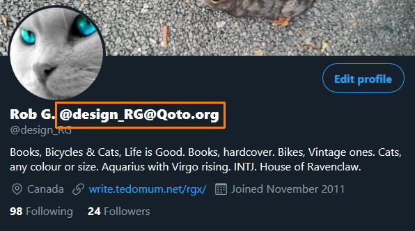 #YoMigroAMastodon --- Pero quizá dejo una mención a los amigos en Twitter? Tuve la idea de añadir mi nombre a Mastodon en lo perfil de Twitter. Así, tus amigos saben donde estás, y hacemos una propaganda para #Fediverso. Que tal? Jajaja... Hasta luego, Jack. #xp #Espana se cambia