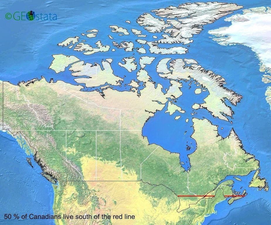 This map is a bit of a classic: Half of Canada lives south of the red line. Source: https://buff.ly/2uzppp1