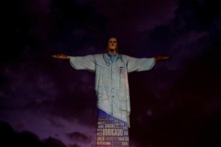 " The statue of Christ the Redeemer was illuminated with the image of a doctor in a lab coat, and the word "thank you"in different languages, in honor of the professionals who are at the forefront of fighting the coronavirus pandemic.