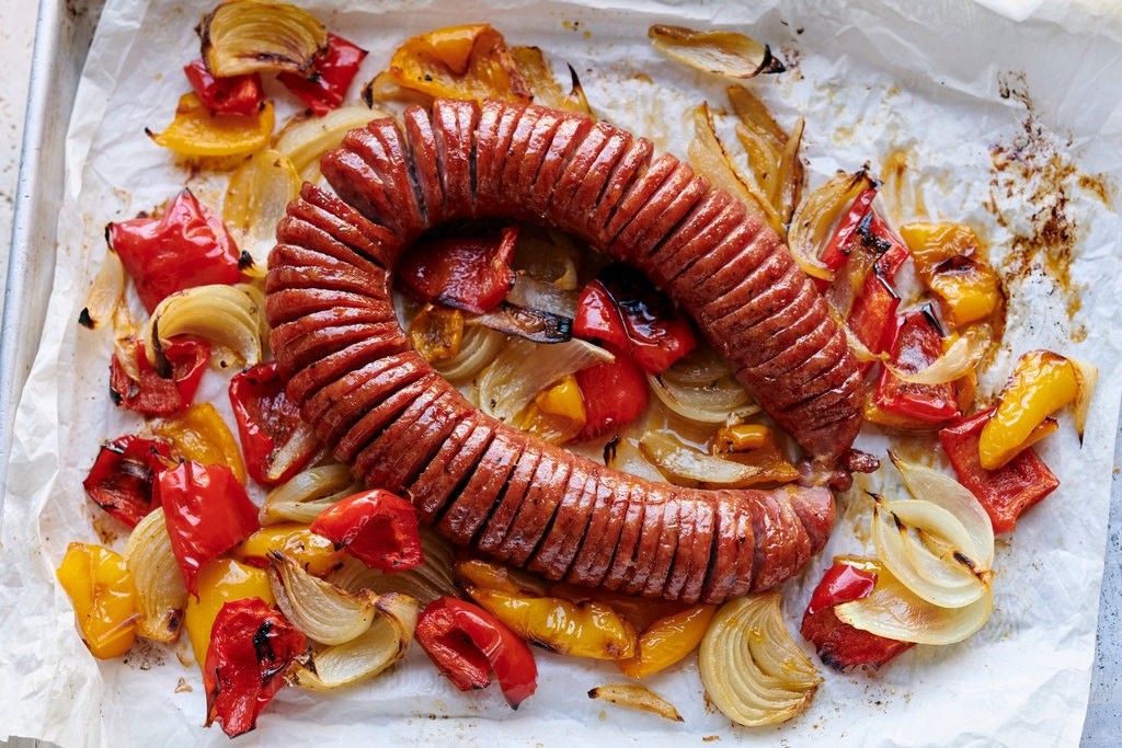 Same idea, roast veggies for accompanying it, cut sausage in thin slices almost thru, and roast in oven.