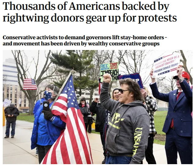 "Thousands of people are preparing to attend protests across the US in the coming days, as a rightwing movement against stay-at-home orders, backed by wealthy conservative groups and promoted by Donald Trump, continues to take hold.