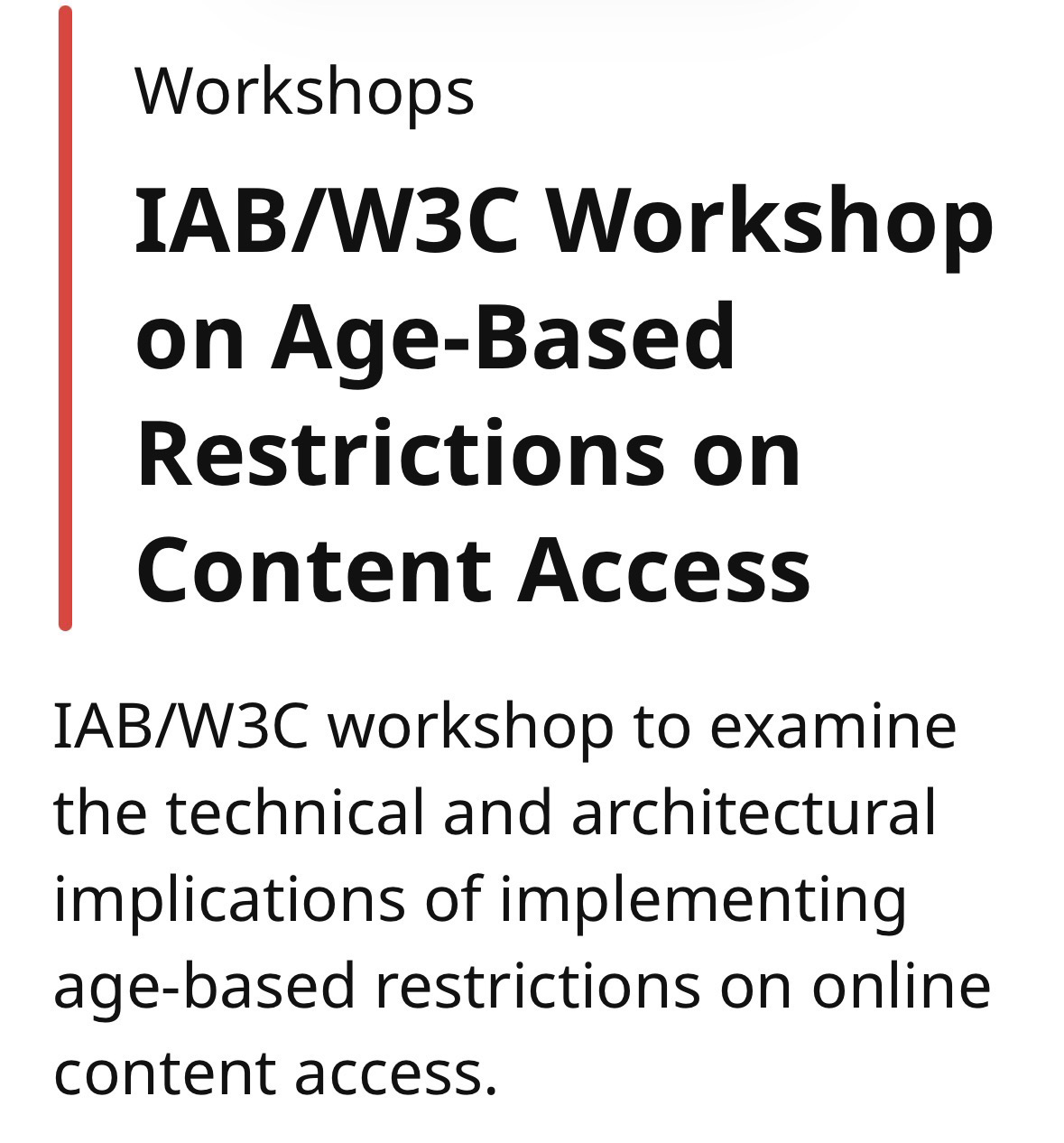 Starting day 1 of the @w3c/@ietf@mastodon.online TAG & IAB workshop on Age-Based Restrictions on Content Access.