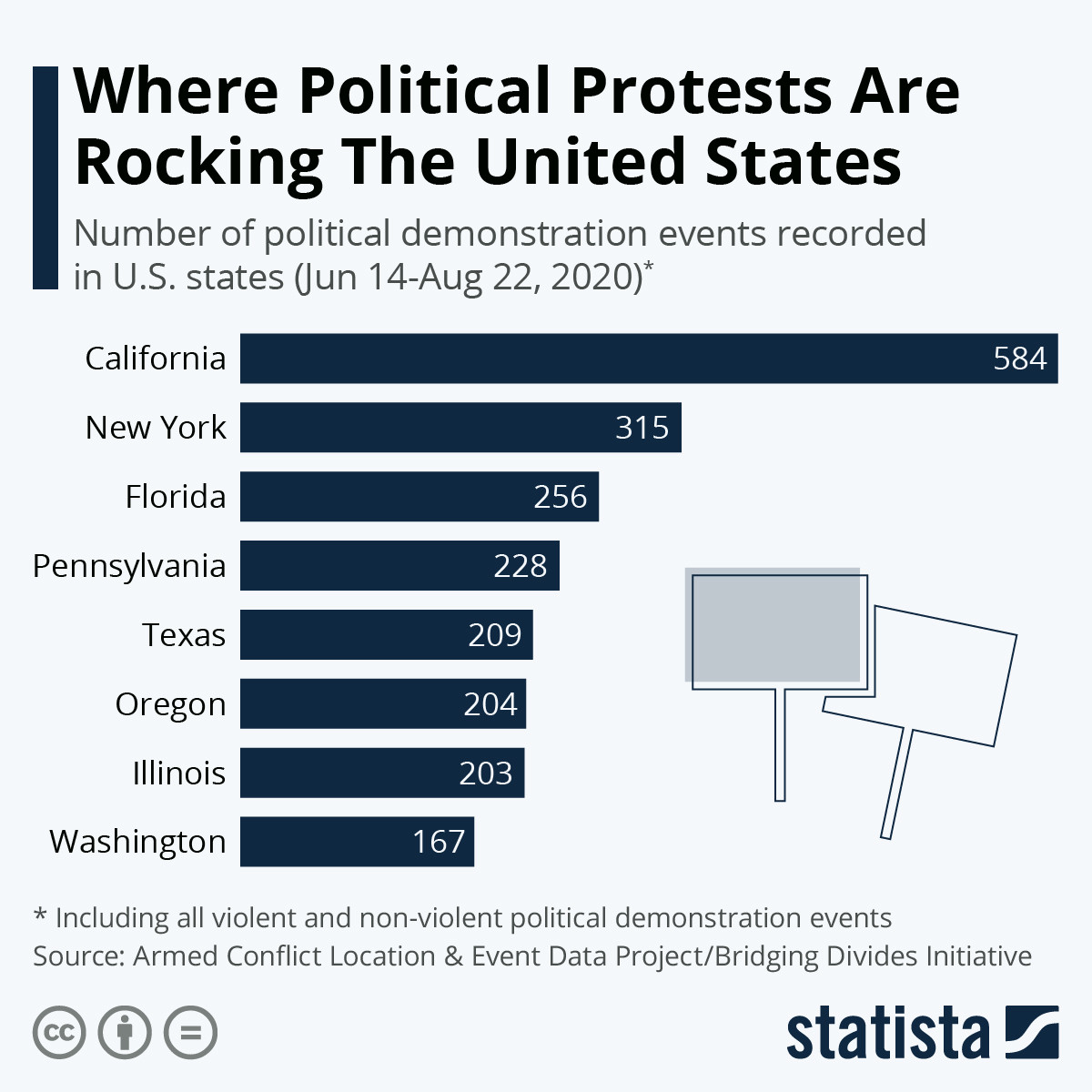 So first look at the attached image. As you can see California, New York Pennsylvania, florida were the places that had the biggest (as well as the largest) number of protests. This roughly aligns with my own data set. Of those five all but oregon had acceptable testing programs to pull from.