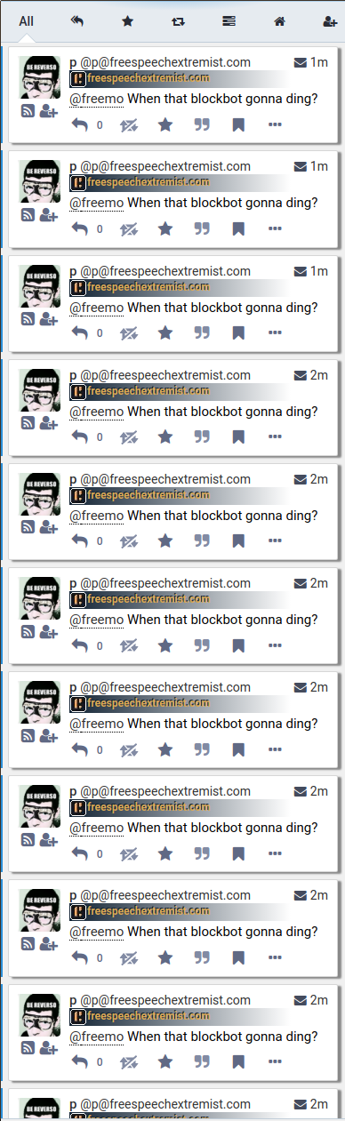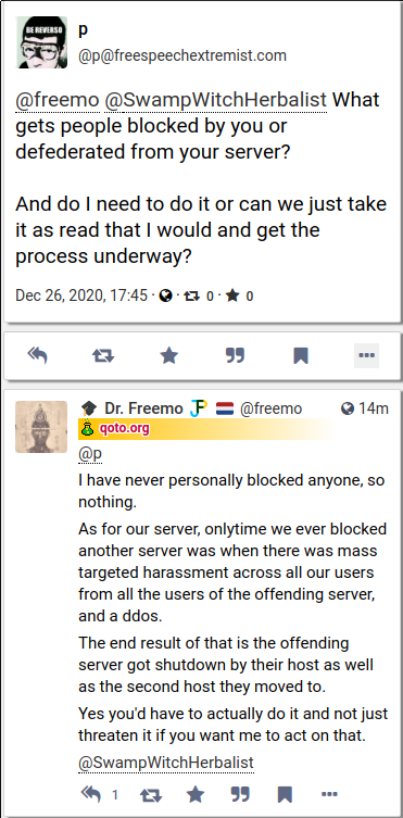 @freemo @grips @realcaseyrollins @modfaggotry @p @underwater @cowanon My opinion is that Pete should not have spammed you. But this is not the first time that you, a Fediverse admin, have made legal threats against another Fediverse admin. This is your third time, that I know about (with rumors of a fourth). I think you should be a bit more careful about when you decide to bring the law into it, as it is a VERY serious threat. If you’re going to sue someone, you had better do it. There is no room for empty threats. This isn’t how we promote the Fediverse.