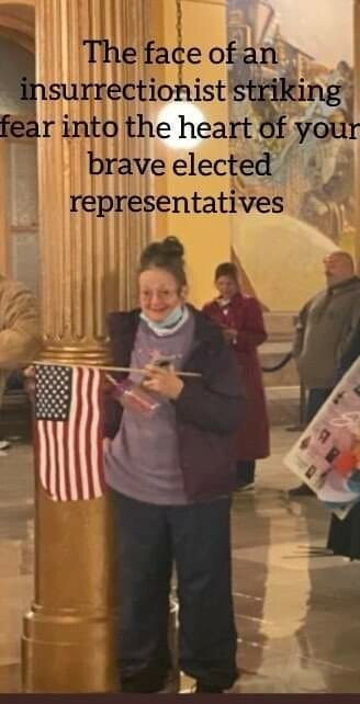 @freemo She is breaking the law and it is part of the insurrected crowd. They have to face punishment as men and stopping hiding behind a little lady.