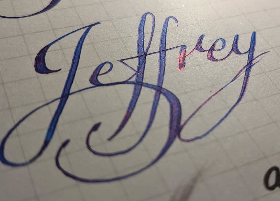 I really can't get enough of this ink. It looks like an unassuming purple-black ink most of the time but if the light hits it on an angle it suddenly becomes gold. It has no sparkles or flecks in it though.