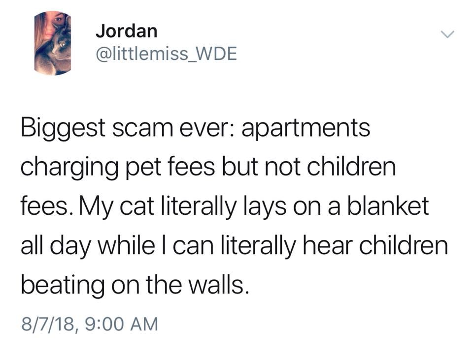 I've owned a dog and a cat, and have many friends with little children. I can say beyond a doubt in terms of physical damage children cause way more than any trained animal. Between their coloring on the walls, physically destroying things, unable to control their bladder, screaming, throwing food when they try to eat it... you'd be hard pressed to find an animal even half as destructive as a toddler.