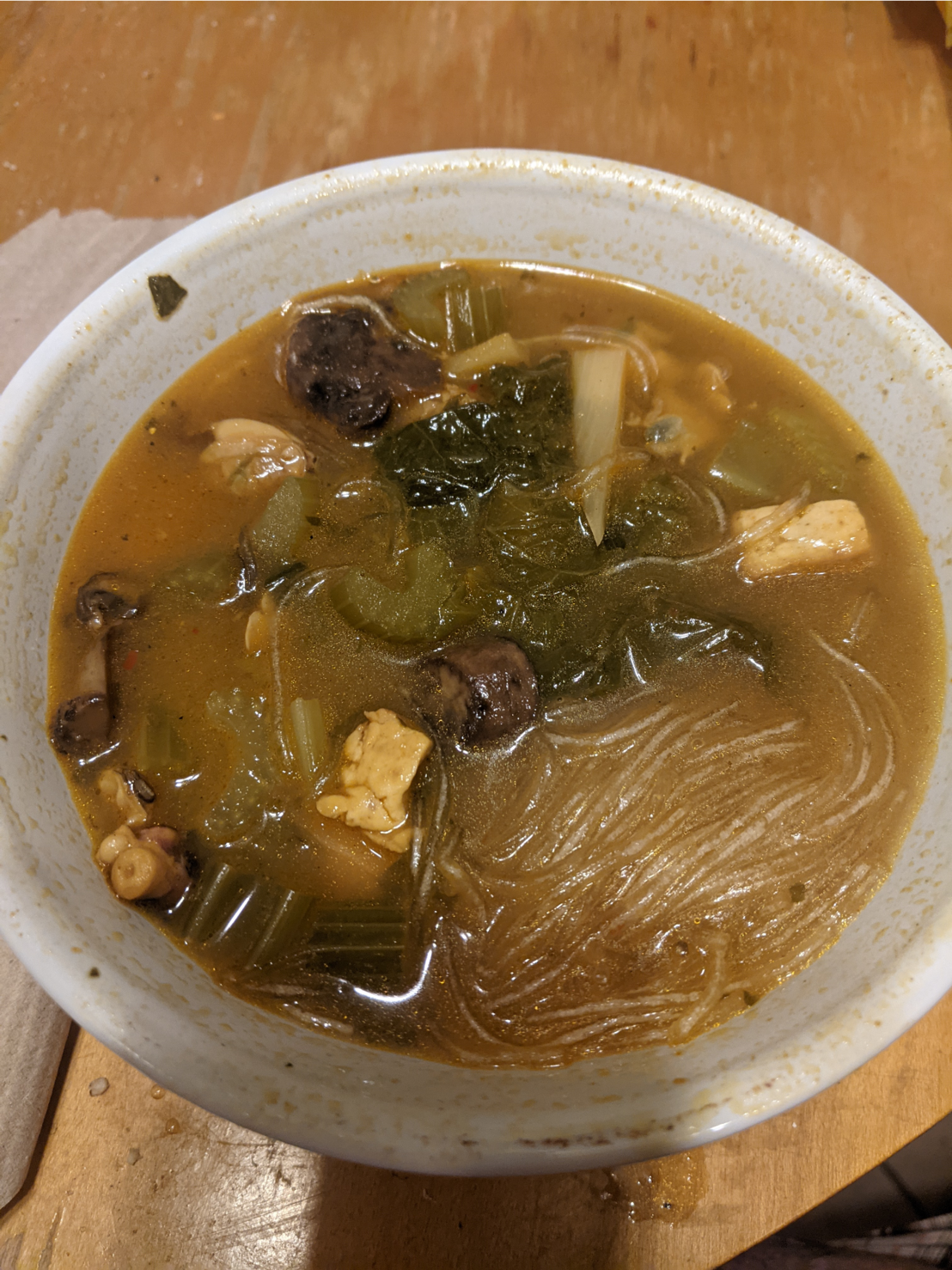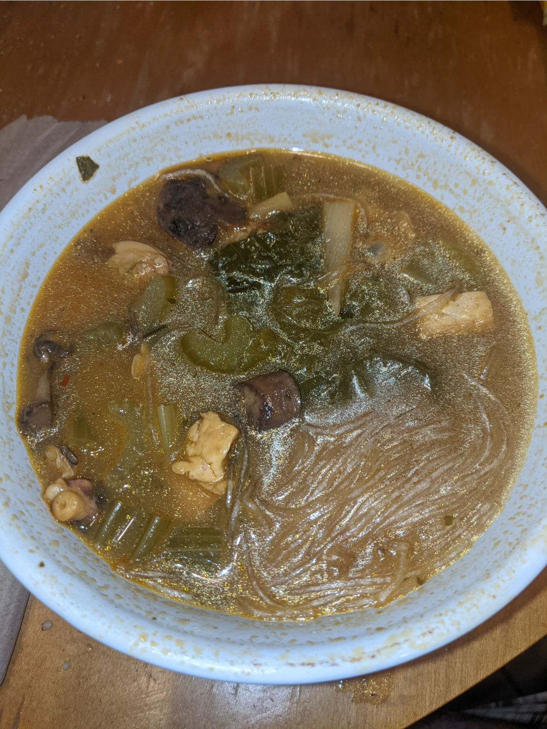 Pressure cooking some asian style seafood soup.. has octopus, anchovies, clams and tofu as the proteins, then bok choi, water chestnuts, bamboo, celery, and mushrooms as the veggies, soup base is Nori, sriracha, ginger, lemon juice, lemon oil, and red pepper.