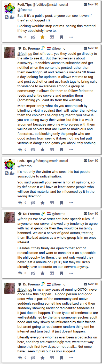 And just because Qoto doesn't block the bad instances itself, Qoto users are suddenly 'people who literally want them and their friends dead'? That's quite a hyperbole.