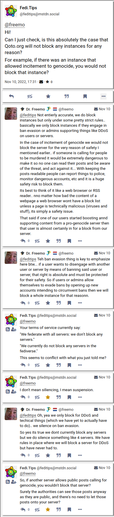 I suspect that the larger servers are not going to actually block Qoto, as this seems to be mostly an issue with smaller more cliquish instances. Gargron himself is (misguidedly) trying not to rock the boat by upsetting these smaller instances' owners, much like a narcissist's family misguidedly tries not to upset the narcissist among them.