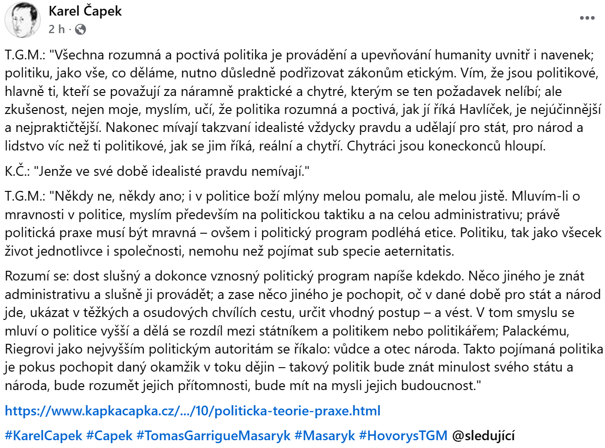 T.G.M.: "All reasonable and honest politics is the execution and consolidation of humanity both internally and externally; politics, like everything we do, must be consistently subordinated to ethical laws. I know there are politicians, especially those who consider themselves terribly practical and clever, who dislike this requirement; but experience, not only mine, I think, teaches that reasonable and honest politics, as Havlíček calls it, is the most effective and practical. In the end, so-called idealists are always right and do more for the state, for the nation, and for humanity than those politicians who are called realistic and clever. Clever fellows are, in the end, stupid."
