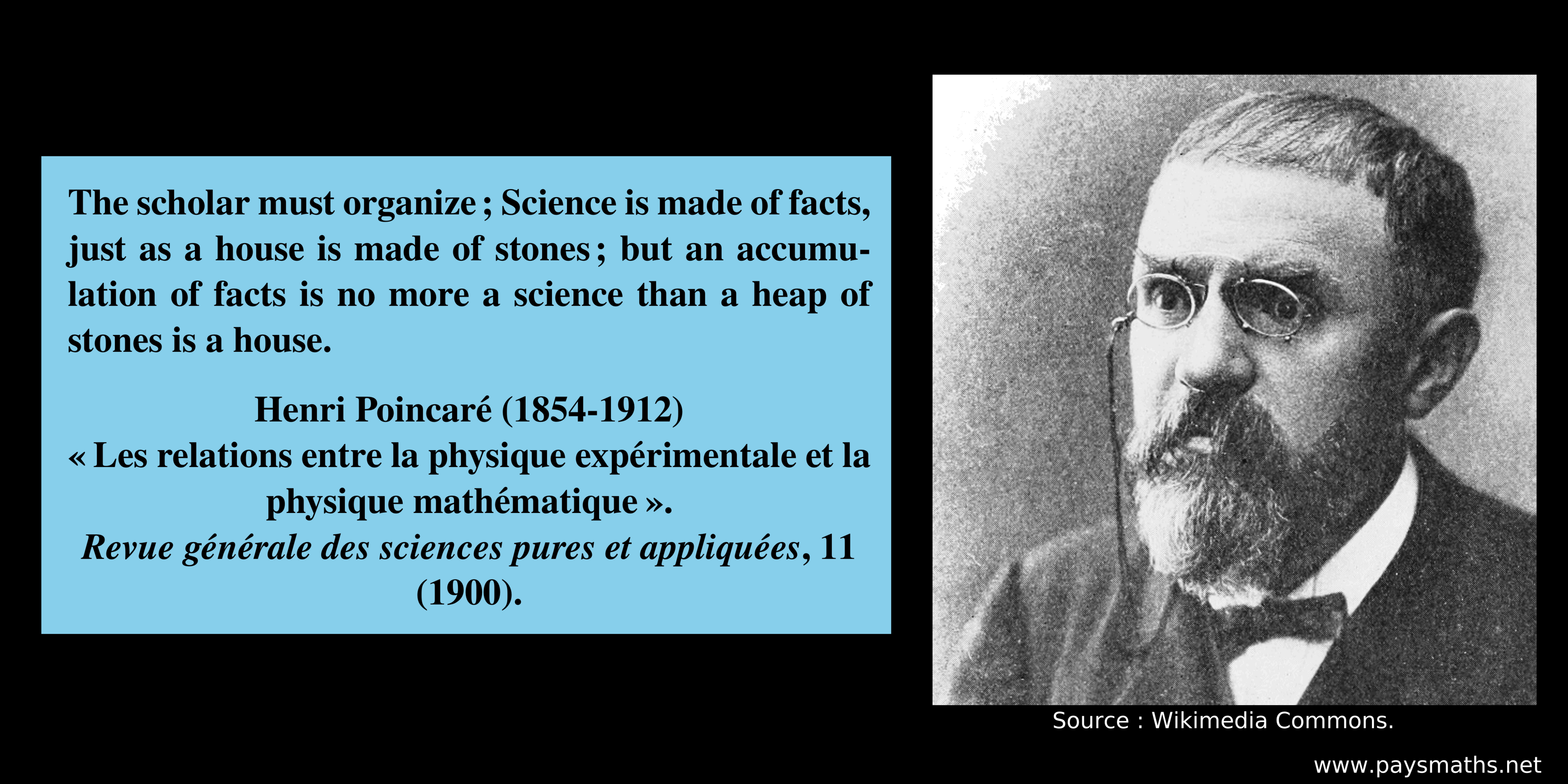 "The scholar must organize ;Science is made of facts, just as a house is made of stones; but an accumulation of facts is no more a science than a heap of stones is a house." – Henri Poincaré (1854-1912)