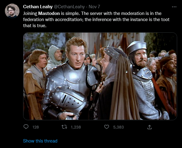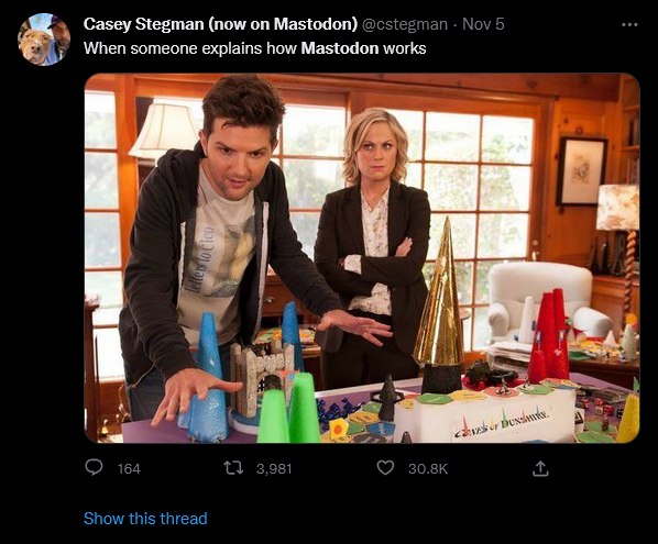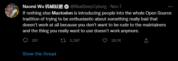 The nice thing about Twitter self immolating is that folks who would otherwise never even look at alternative platforms seem to be kicking the tires and trying to make things work on other sites. Really helps with the chicken/egg issue. If Twitter -> Mastodon works, no reason to think there isn’t hope for Facebook -> Diaspora (or similar). At that point, only thing left to do would be to make friends to connect with. Exciting days ahead!