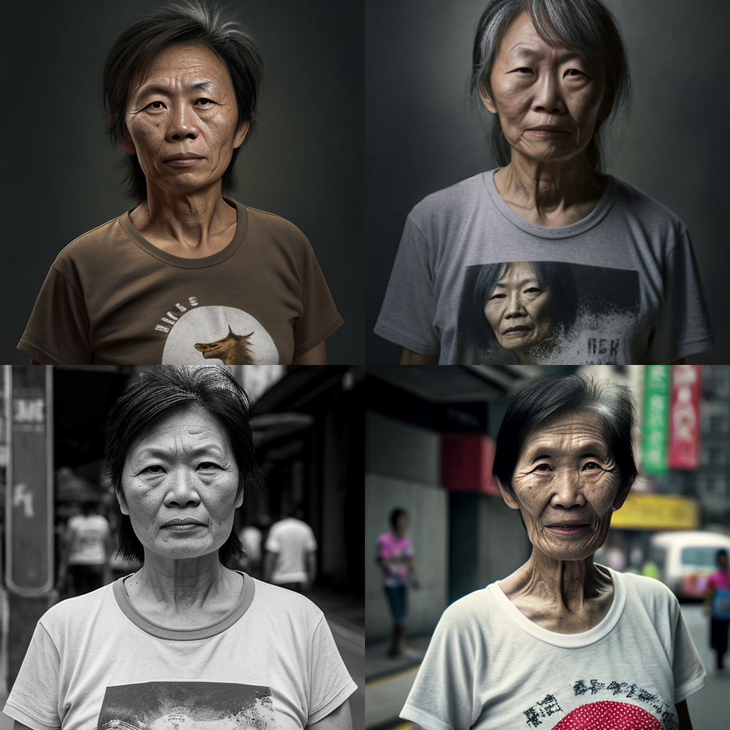 "47-year-old Hong Kong woman wearing a t-shirt, photograph, 32k"