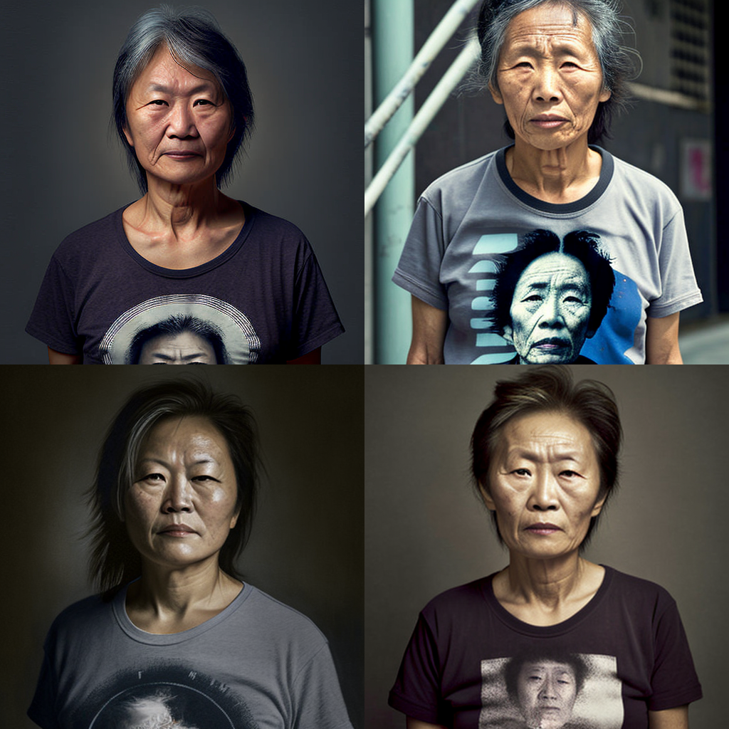 "47-year-old Chinese woman wearing a t-shirt, photograph, 32k"