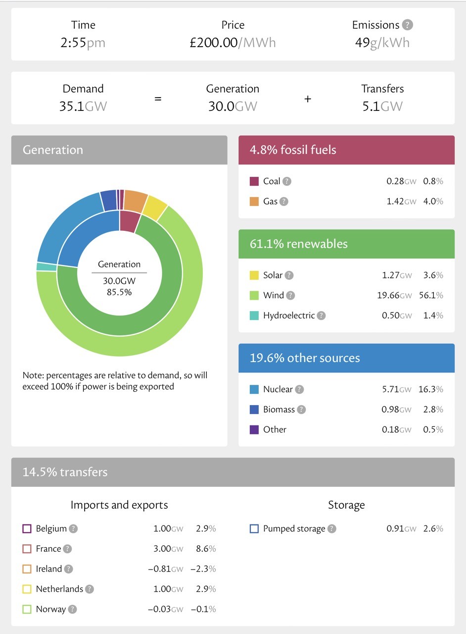 The National Grid is supposed to be capable of running without fossil fuels by 2025 but, looking at these numbers, it is getting very close to doing it for the first time already. Gas is producing just 1.42GW within a total demand of 35.1GW. That’s 4%. Coal adds another 0.8%. Wind, meanwhile, is making 19.66GW. Excuse me if I’m excited but the first time Britain runs without fossil fuels — even if it’s just for ten minutes — will be a big deal.