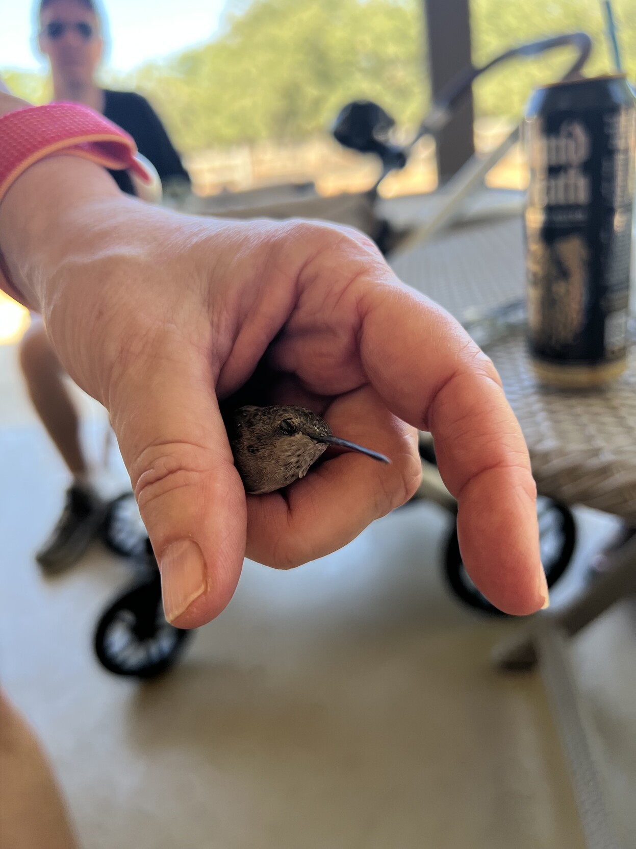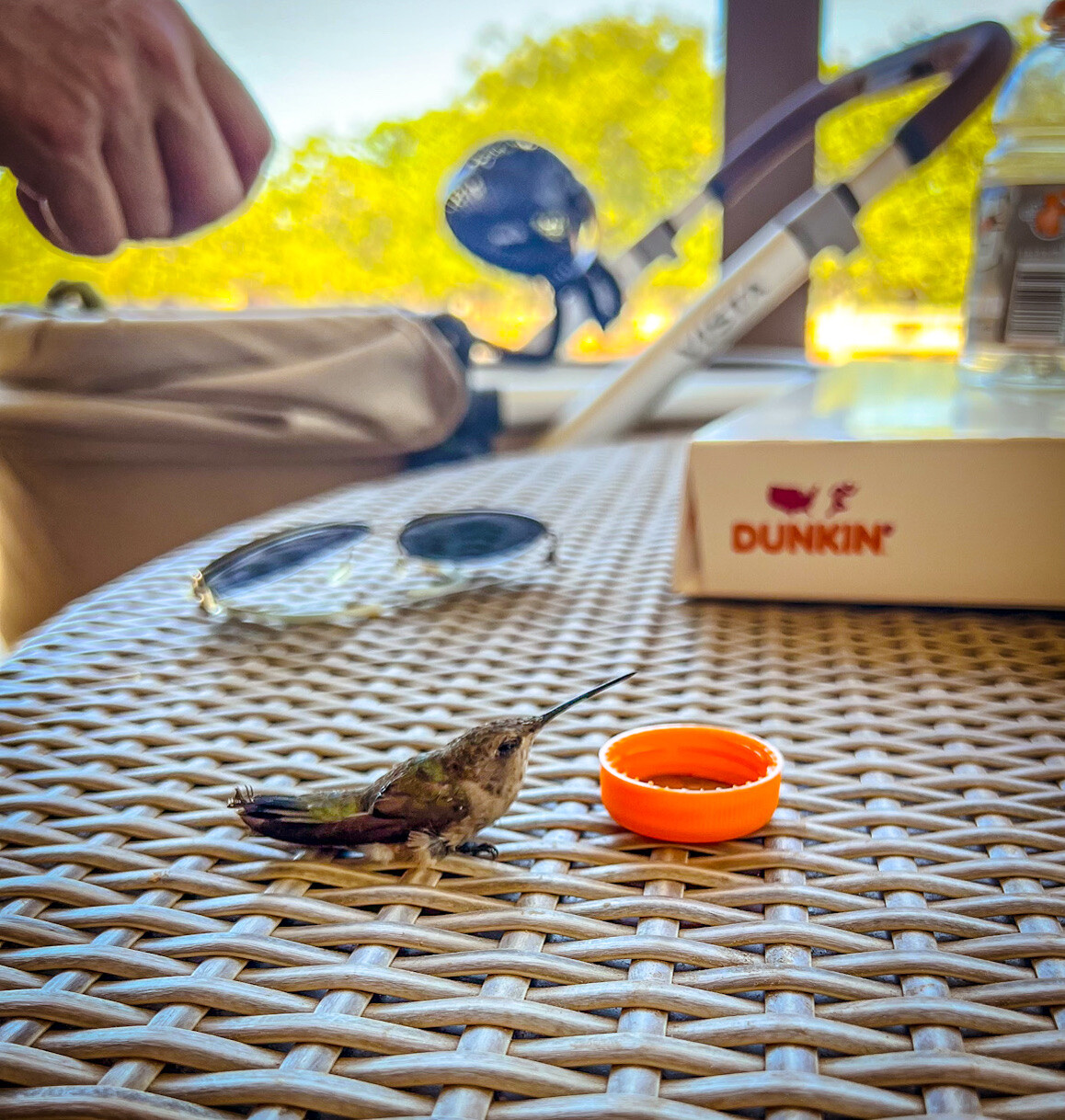 Hummingbirds, who don’t typically land on porches, have crazy metabolism and require nutrients something like every hour or they go tits up. This one was in trouble. Springing into action, the group mobilized with but a single, unified thought: SAVE THE BIRD. I scooped it up, Bjorn produced Gatorade*, and Niece shouted, “use a bottle cap for a dish!”